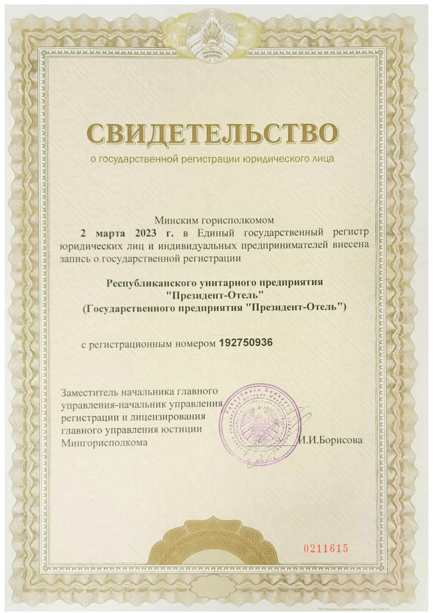 УНП 192750936 св-во выд. 02 марта 2023 года Минским Городским исполнительным комитетом